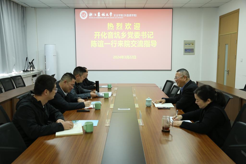 3月22日,开化县音坑乡党委书记陈谊等一行来访williamhill英国,就院地合作事宜进行深入洽谈,院长鲁可荣、学院党委副书记冉琰等学院领导出席并参加座谈。