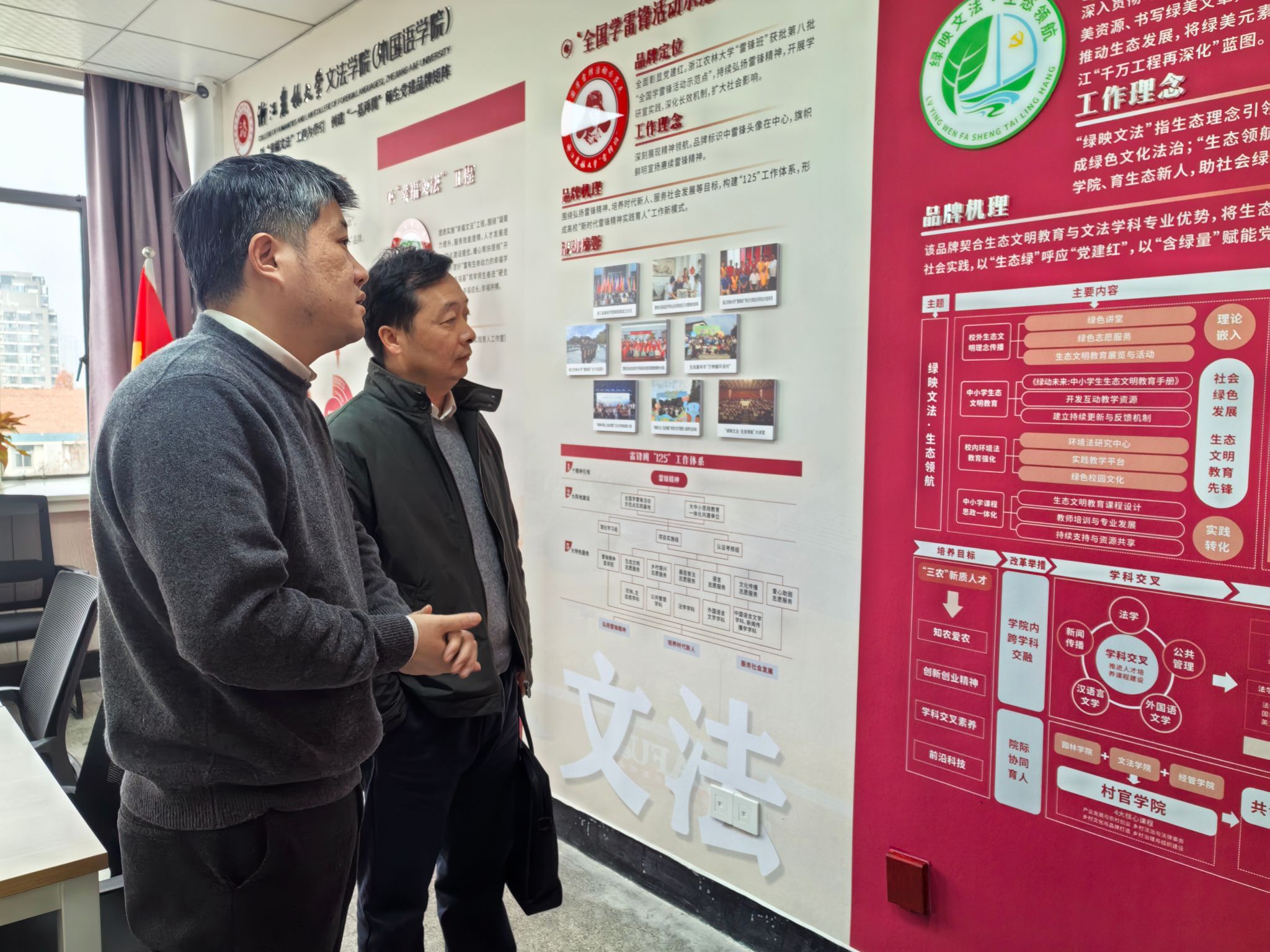 会后,倪建均一行参观了“幸福文法之家”“书香文法走廊”和一基两翼”党建品牌构想展示墙,对学院文化建设成果给予高度评价。