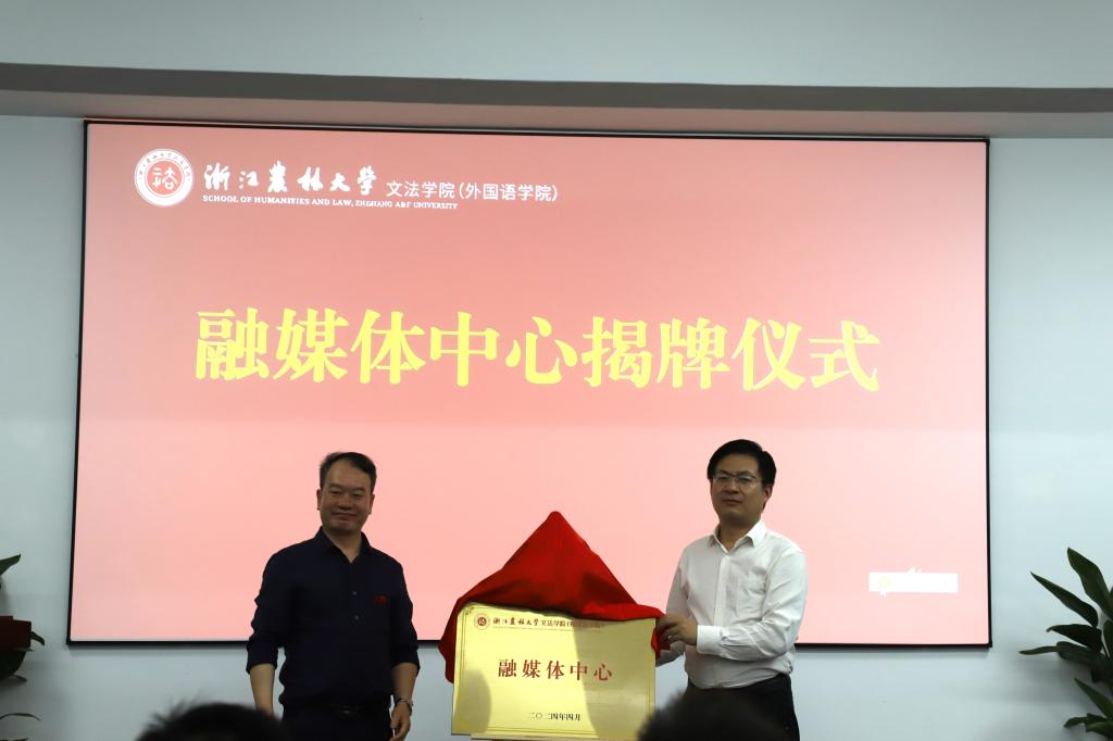 朱红东宣布学院融媒体中心成立,与陈胜伟共同为融媒体中心揭牌。