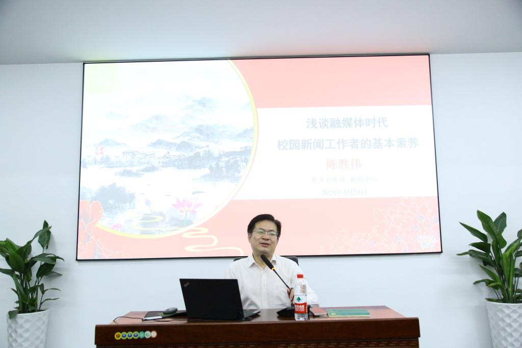陈胜伟以《浅谈融媒体时代校园新闻工作者的基本素养》为题,为融媒体中心专职工作人员作了新闻写作实务培训,主要围绕新闻常识、新闻采访、新闻写作、新闻摄影、新闻编辑等,作了深入浅出、精彩生动的讲授。