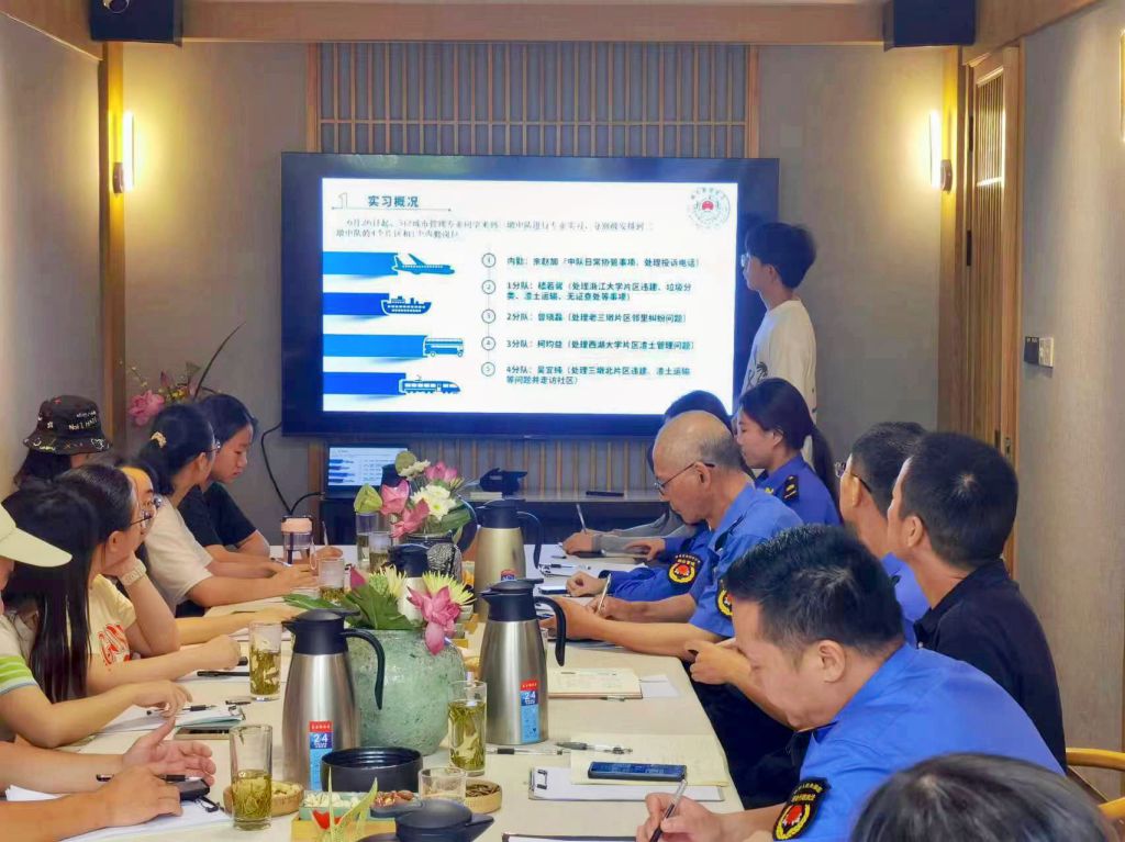 7月10日下午,城市管理专业暑期实习中期汇报会在杭州举行,鲁先锋、胡榕和实习学生参加汇报会。会议特邀西湖区综合行政执法局综合督查中心颜治主任、西溪中队长黄作星、三墩中队教导员褚亚涛、蒋村中队胡红卫出席会议。