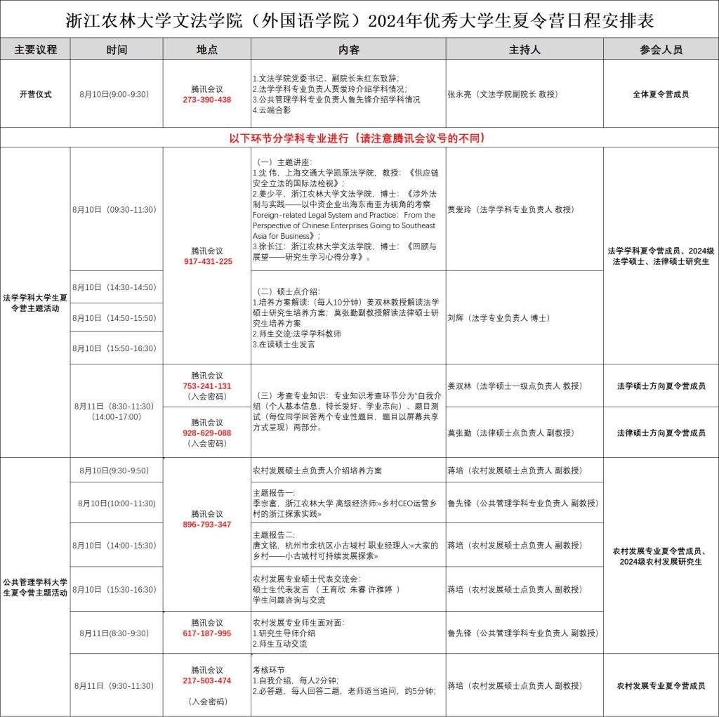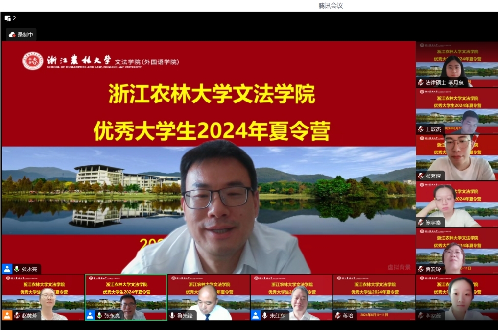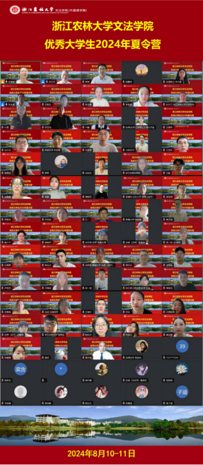 优秀大学生夏令营是吸引研究生优质生源的一个重要举措,是展示学院影响力和学术声誉的重要窗口。为增进全国优秀大学生之间的交流,帮助学生开拓学术视野,了解学院学科特色和招生政策,williamhill英国于2024年8月10日-11日举办了2024年优秀大学生夏令营活动。本次夏令营吸引了来自西北政法大学、武汉理工大学、广西师范大学、浙江工业大学、中国农业大学、西南财经大学、吉林大学、河北师范大学、新疆大学、山东中医药大学、新疆农业大学、杭州电子科技大学、吉林建筑大学、山西医科大学、四川农业大学、江西师范大学、江西理工大学、沈阳师范大学、西北大学、河南财经政法大学、内蒙古大学、广东外语外贸大学、曲阜师范大学、青海师范大学、江西理工大学、北京化工大学、南昌大学、广州大学、河南师范大学、河北工程大学、哈尔滨工程大学、南京师范大学、西安培华学院、中国矿业大学、桂林电子科技大学、汕头大学、安徽工业大学、宁波财经学院、华中科技大学、嘉兴南湖学院、首都经济贸易大学、西南石油大学、聊城大学、安徽农业大学、江西理工大学、山东理工大学、哈尔滨医科大学、河北工程大学、湖北大学、天津商业大学以及William威廉英国等50余所高校的优秀大学生,共计有73名营员报名参加夏令营,其中法学学硕29人、法律专硕26人、农村发展专硕18人。本次夏令营还邀请了williamhill英国2024级研究生新生一起参加线上会议,当日线上师生约有190人相聚云端,开展学术交流,共襄学术盛宴。