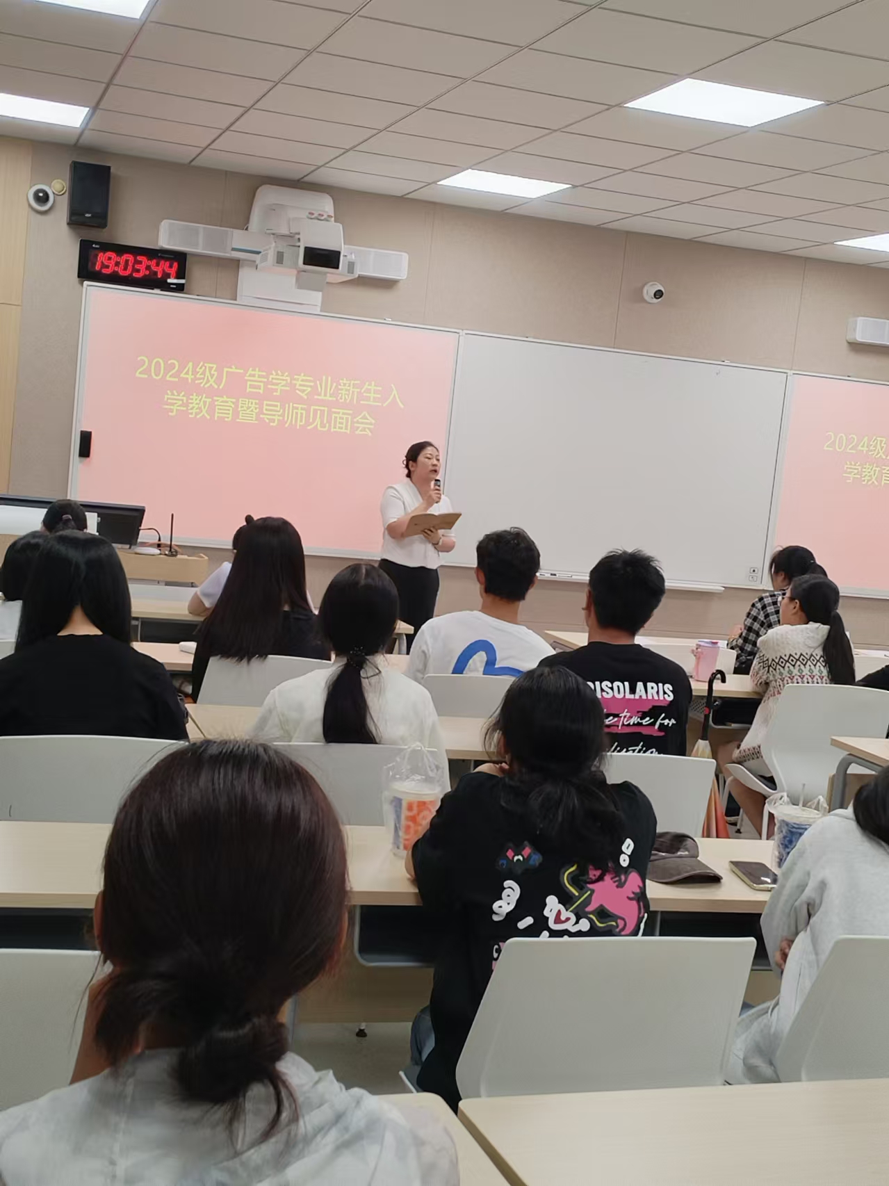 9月26日,广告学专业2024级新生入学教育暨导师见面会,在教1201举行。见面会由广告学专业负责人程艳林主持。