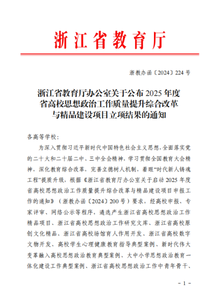 近日,浙江省教育厅办公室公布2025年度省高校思想政治工作质量提升综合改革与精品建设项目立项结果。徐达副教授主持的 “‘千万工程’研究与实践育人工作室”入选“2025 年度浙江省高校辅导员名师工作室”,获2025年度省高校思想政治工作质量提升综合改革与精品建设项目立项。