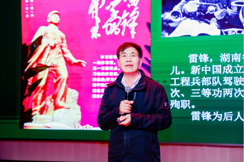 卜金宝以《雷锋,一座精神丰碑》为题,从“我与开国将军”的故事讲起,指出英雄团队是雷锋成长的沃土,揭示英雄团队对雷锋精神的培育作用,强调集体环境对个人价值观塑造的关键影响。接着,他结合雷锋精神与英雄模范事迹,以苏鸿熙“科学无国界,科学家有祖国”的抉择,与雷锋“把有限的生命投入无限为人民服务”的信念形成跨时空的共鸣,寄语青年人“要有信仰,好好工作,帮助他人”。为了帮助青年人更好地传承雷锋精神,他对青年人提出五点希望:要向上,树立理想;要崇善,充满爱心;要阳光,乐观开朗;要求真,热爱科学;要珍惜,将其作为一种人生态度。激励师生接续传承新时代雷锋精神。