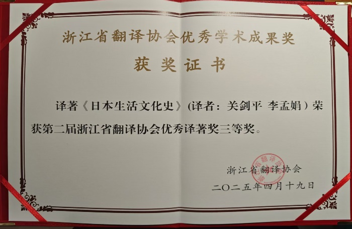 年会过程中也对2024年的翻译成果进行了颁奖。我院李孟娟老师和茶学与茶文化学院关剑平老师合译的著作《日本生活文化史》荣获第二届浙江省翻译协会优秀译著三等奖。