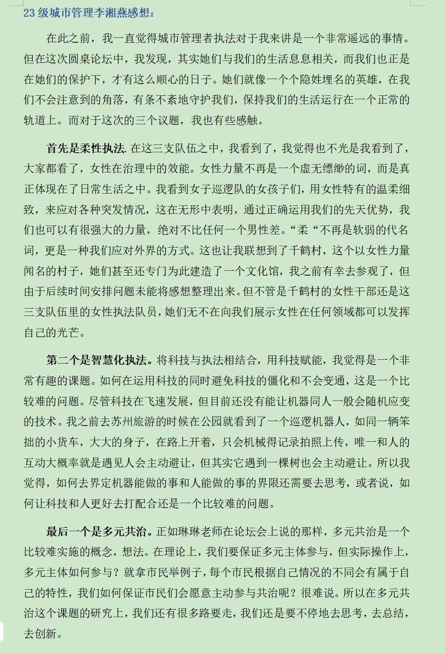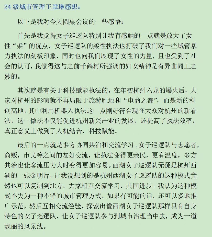 李琳琳副教授在总结发言中强调,女子巡逻队的成功实践既彰显了女性特有的沟通优势,更展现了团队协作产生的强大聚合效应。她指出,推动城市多元共治需要持续的经验交流和理论实践转化。活动结束后,与会师生纷纷表示,通过此次活动不仅见证了科技赋能下女性执法者的专业风采,更深刻体会到“女性力量”绝非简单标签,而是能够切实转化为城市治理效能的宝贵资源。本次交流会通过智慧碰撞与经验共享,不仅为创新城市治理模式提供了新思路,更生动展现了新时代"巾帼执法"刚柔并济的独特魅力和专业价值。
