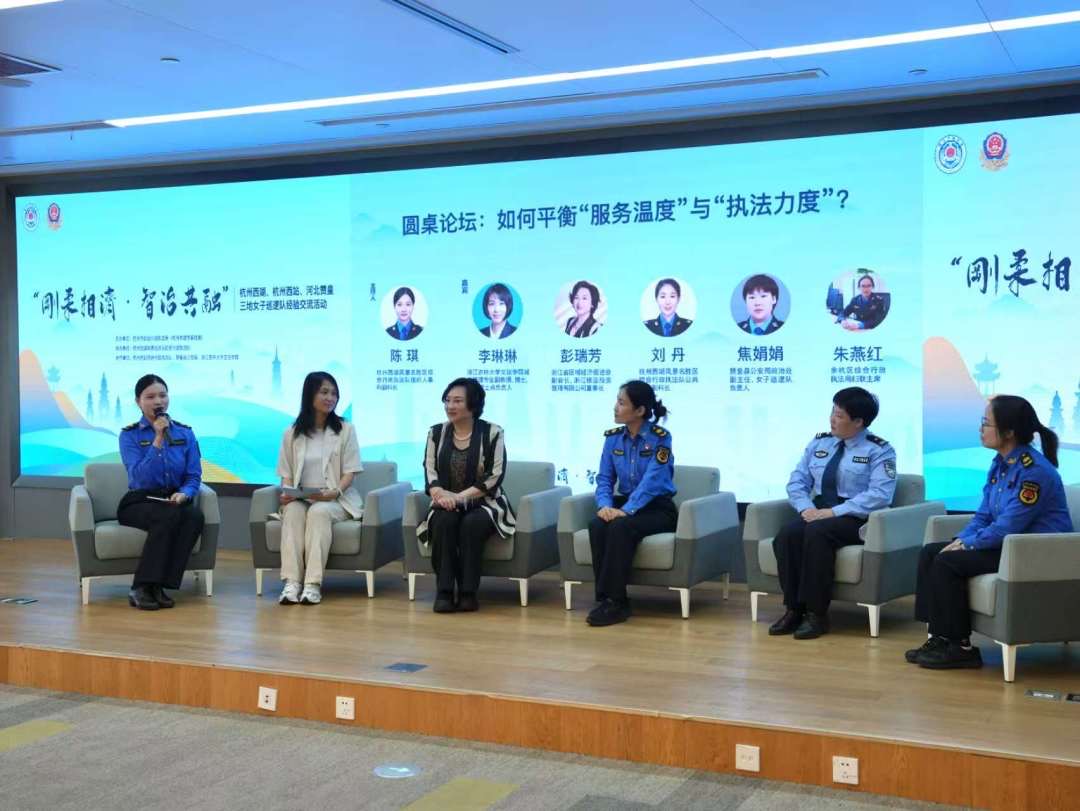 刘丹副科长动情讲诉了西湖景区帮扶无证摊贩转型创业的暖心案例,诠释了“执法为民”的深刻内涵;朱燕红主席生动展示了杭州西站运用智能机器人和无人机等科技手段的创新实践;焦娟娟副主任则分享了赞皇公安“刚柔并济”的执法理念和深入基层的民意收集机制。彭瑞芳董事长从市民角度建言,高度评价了三方女子巡逻队在城市治理中的突出贡献,同时提出将AI数字技术融入城市管理,通过数字化手段拓宽公众参与渠道的建议。