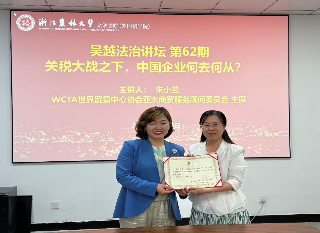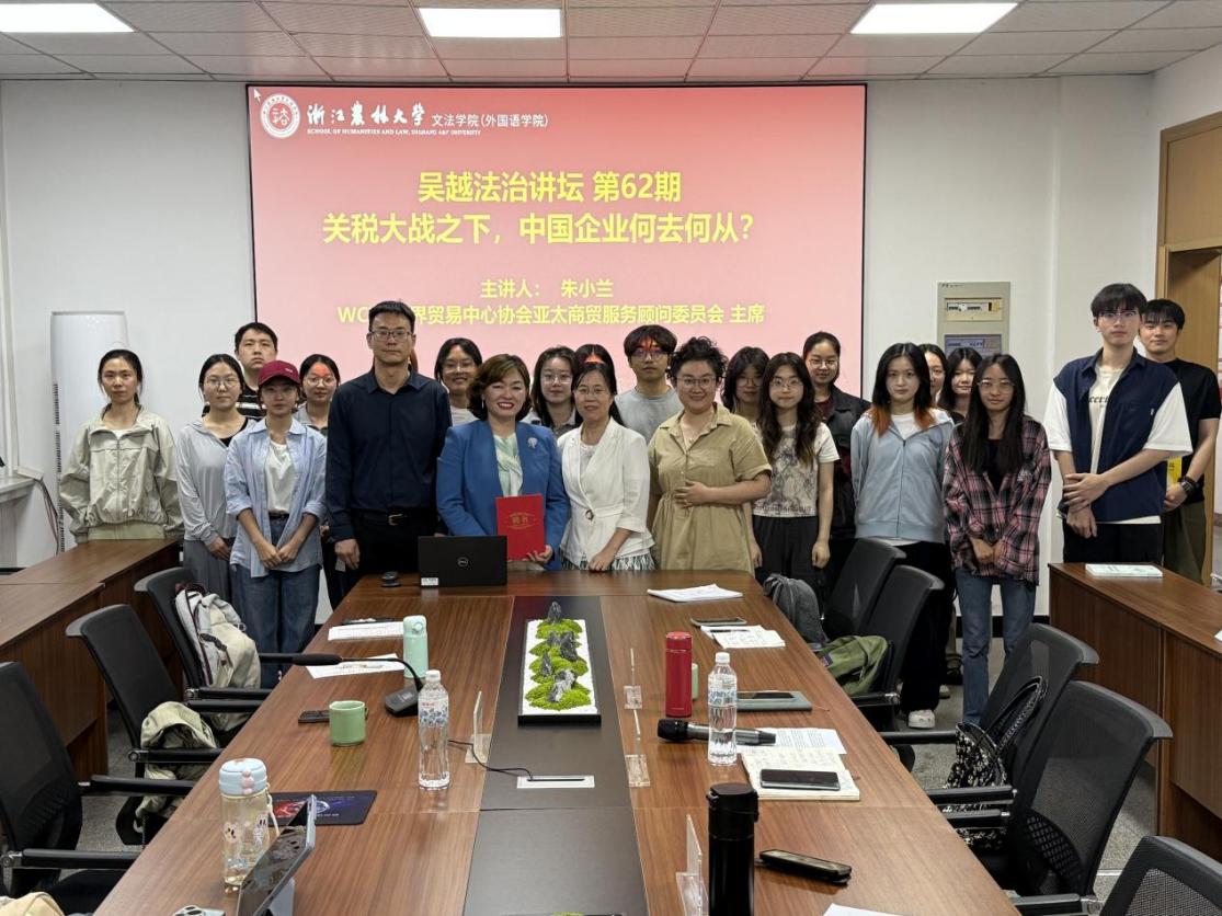 4月25日下午,WTCA世界贸易中心协会亚太区商贸服务委员会主席朱小兰来学院,以“中美关税大战,中国企业何去何从”为主题作学术报告。副院长张永亮、法学学科负责人贾爱玲、涉外法治基地办公室主任姜少平,以及法学专业50余名师生聆听报告会。