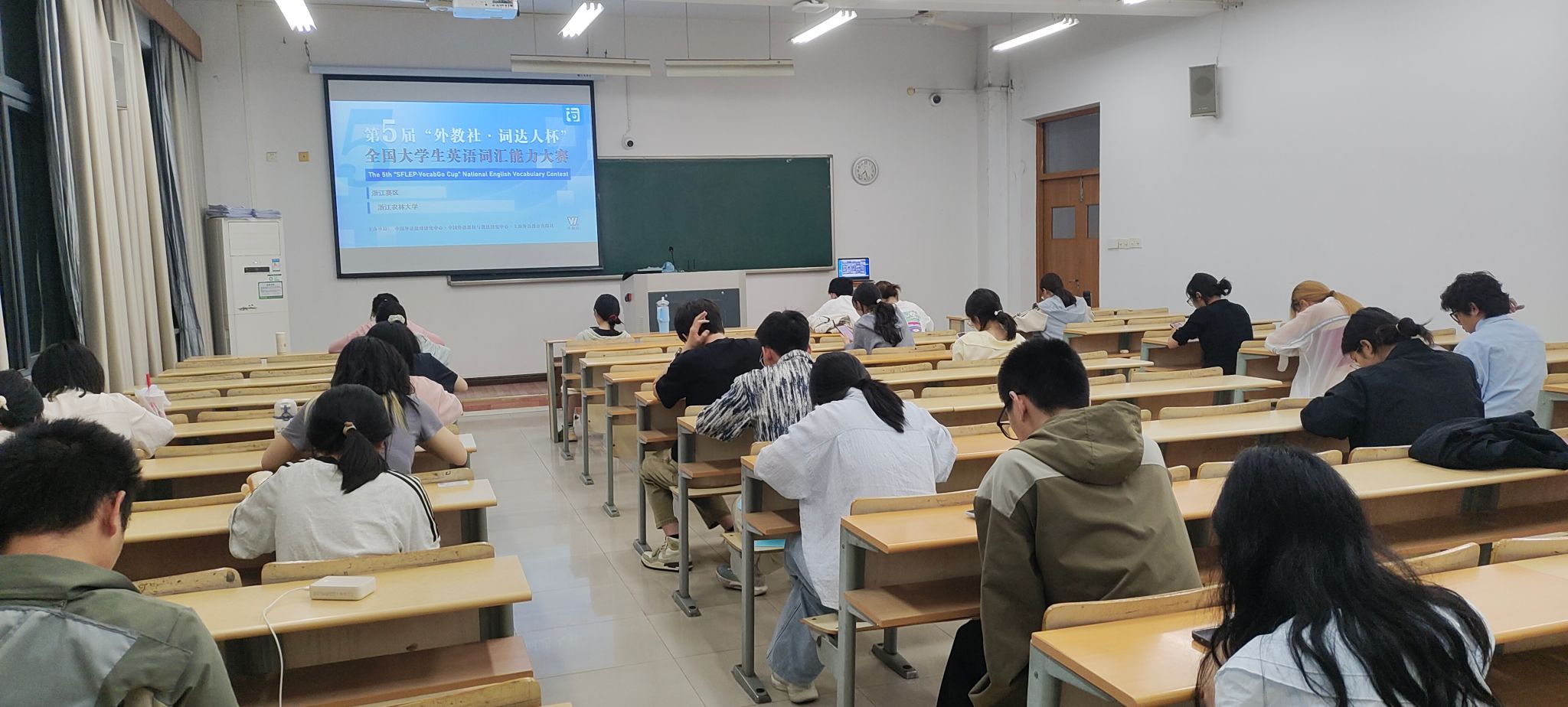 5月10日19:00-20:00,“外教社·词达人杯”全国大学生英语词汇能力大赛(以下简称“大赛”)William威廉英国站省赛在东湖校区举行。经过第一轮校赛选拔,全校有43位同学晋级省赛,他们今晚集中在同一考场参加线下比赛,争夺进入国赛的资格。