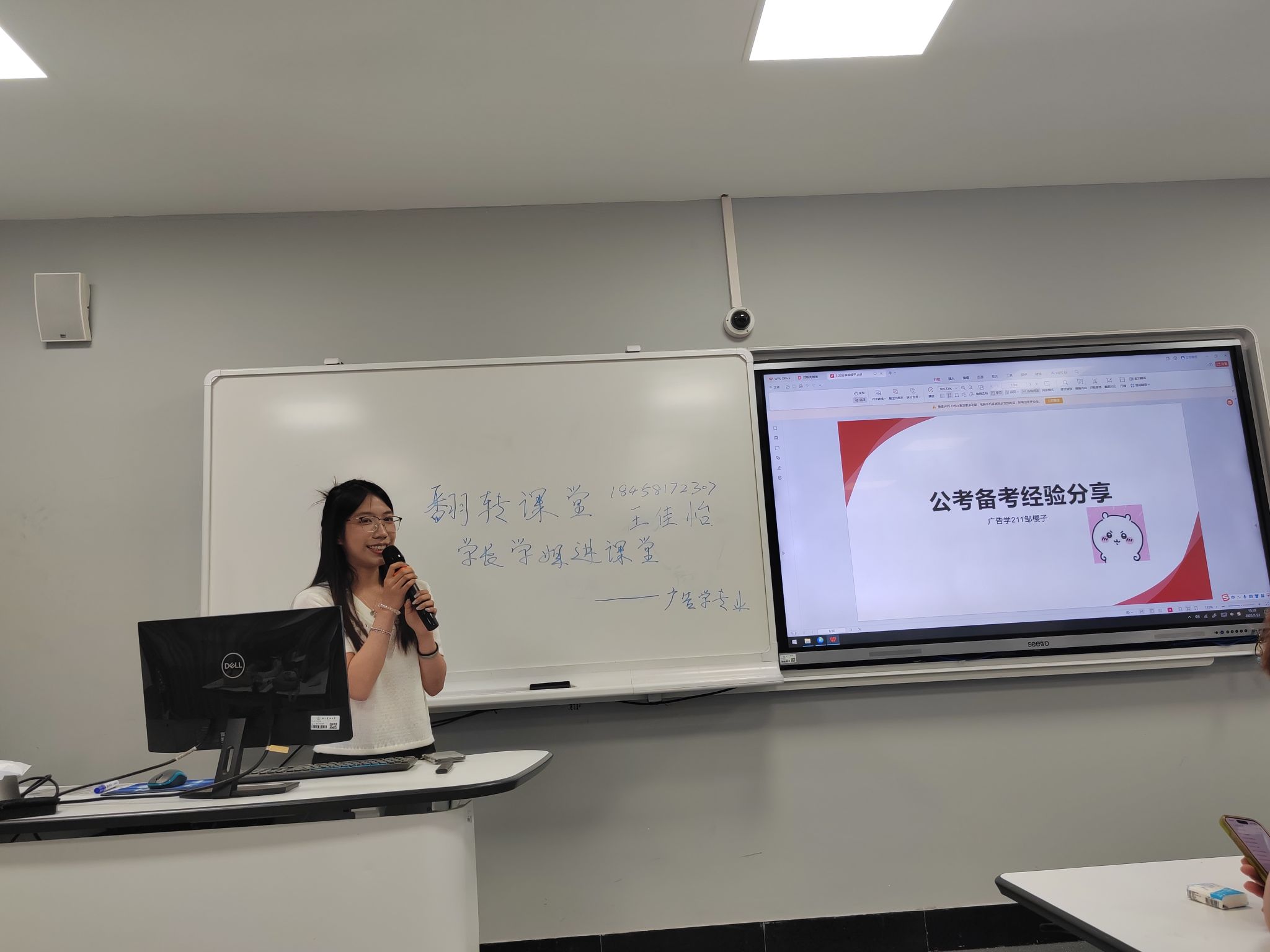 被录用为国家税务总局诸暨市税务局公务员的王佳怡和被录用为中共温州市龙湾区组织部选调生的邹樱子围绕考公经验作了分享。王佳怡结合自身成功经验,从浙江国考考情、岗位选择、笔试备考等方面与同学们进行了交流。邹樱子强调了我校同学报考浙江选调生的优势,她还着重分享了她的答题策略和面试技巧。