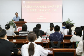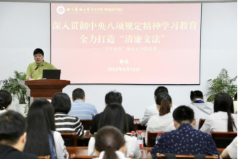 院长鲁可荣以“深入贯彻中央八项规定精神学习教育 全力推进‘幸福文法’工程”为题,结合学院高质量发展实际,深入阐述了中央八项规定精神对营造风清气正办学氛围的重要意义,并深情鼓励青年教师在教学科研中严守纪律底线,以“一杆子插到底”的担当作为为学院内涵式发展添砖加瓦。党委副书记(主持工作)徐达以“深入贯彻中央八项规定精神学习教育 全力打造‘勤廉文法’”为题,结合违反中央八项规定精神典型案例,深刻剖析了违纪违规风险点,他勉励青年教师筑牢思想防线,将“勤廉文法”要求融入日常教学、育人工作,以良好作风师德师风助力院风教风学风一提推进一体提升。