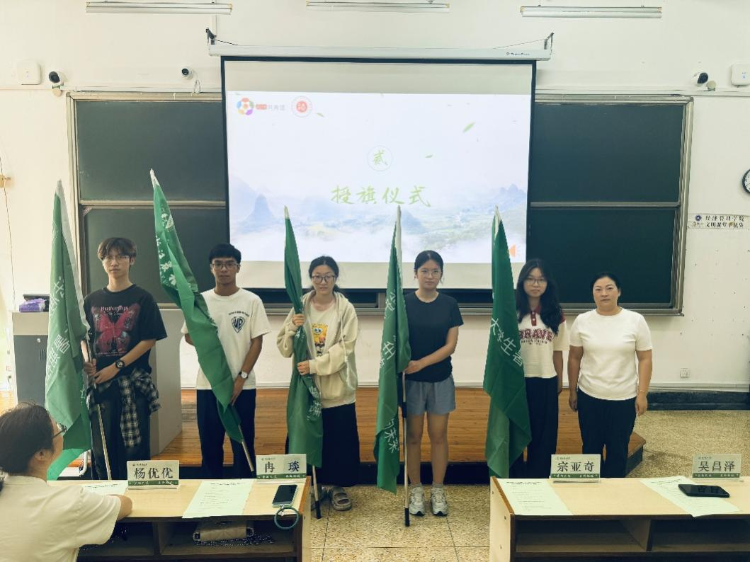 随后,党委副书记冉琰,学生办主任杨优优,学生会秘书长吴昌泽,研究生会秘书长李姗姗分别为参加本次暑期社会实践的团队进行授旗。