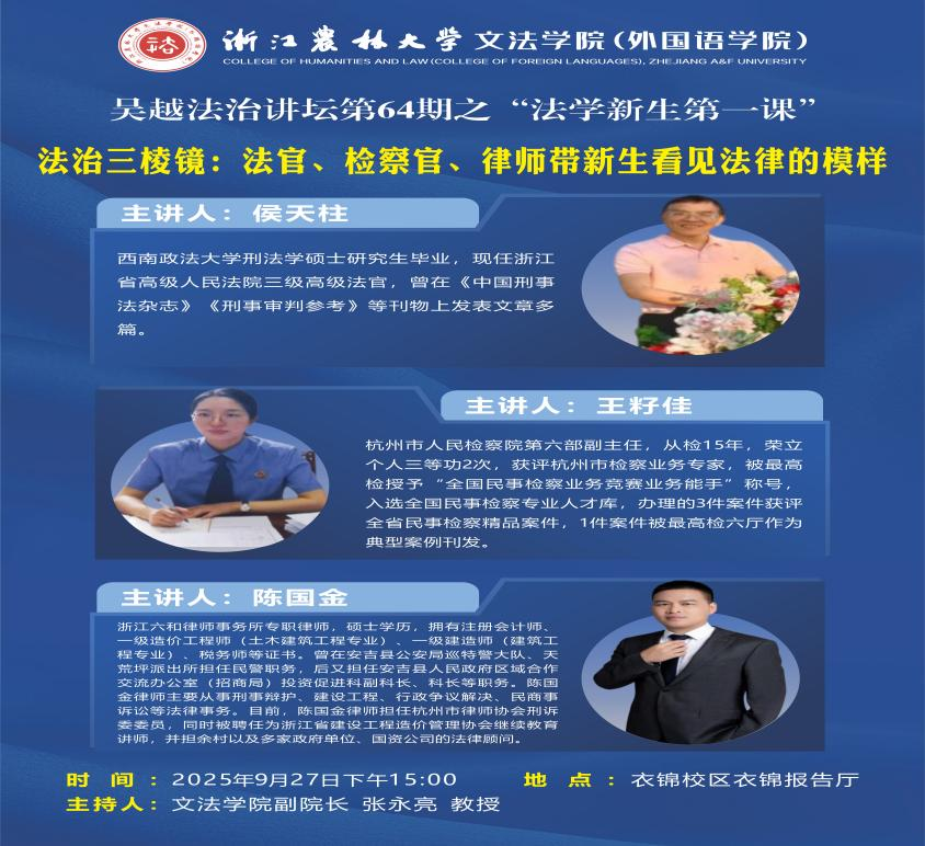 9月27日,法学学科邀请浙江省高级人民法院三级高级法官侯天柱、杭州市人民检察院第六部副主任王籽佳、浙江六和律师事务所专职律师陈国金为法学新生讲授入学第一课。他们分别从法官、检察官、律师的视角,阐释了职业定位、职业特征和职业要求,与全体新生共话成长,为新生开启专业探索的新篇章。williamhill英国副院长张永亮教授主持本次讲坛。