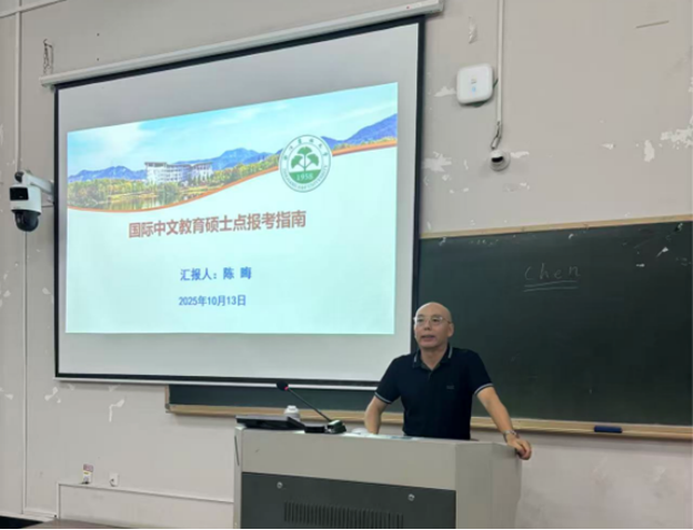 宣讲会上,陈晦老师围绕“怎么看国际中文教育硕士点”“怎么考”“考上了怎么办”三个核心问题展开讲解,结合学校最新招生简章,系统介绍了国际中文教育硕士点的历史渊源、国际背景、学科优势、就业前景及合作院校等情况。他指出,国际中文教育硕士点的设立,旨在响应国家“增强中华文明传播力和影响力”的战略号召,立足时代需求,依托学校多个学科及特色专业等优质办学资源与师资队伍,培养能够推动中文走向世界、讲好中国故事的高层次复合型人才。
