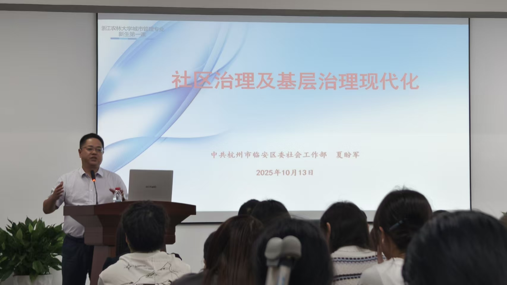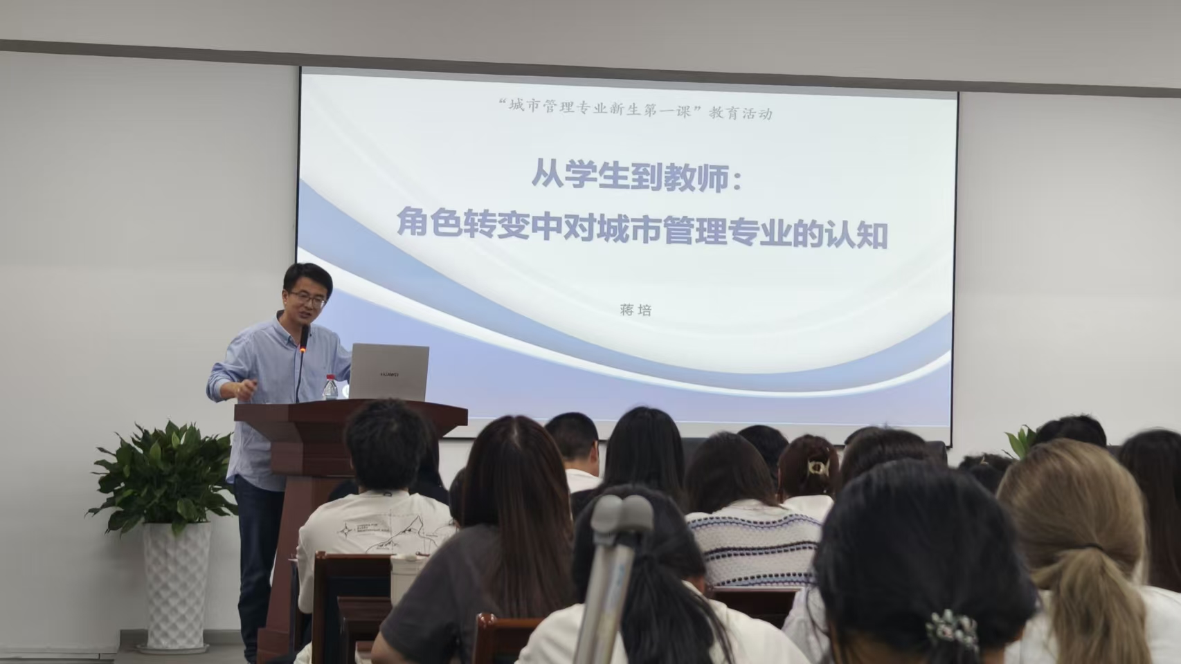 在专题报告环节,三位嘉宾为新生带来了精彩纷呈的专题讲座。葛宝根主任以“在AI时代和数字经济背景下构建城市治理新格局”为题,通过智慧城市管理实践案例,生动阐释了人工智能技术如何赋能现代城市治理,展现了数字化城市管理的发展前景。夏盼军副部长聚焦“社区治理及基层治理现代化”,结合 “吴越明理亭”议事协商、“党建领航、幸福石铺”等创新实践,深入浅出地讲解了党建引领如何有效解决群众“关键小事”,激励同学们未来投身基层治理事业。蒋培副教授以“从学生到教师:角色转变中对城市管理专业的认知”为题,从知识、实践、发展三个维度系统解析了专业特色,指出城市管理是一门兼具理论深度与实践价值的专业,并鼓励新生在大学期间不断锤炼自我,全面提升综合素质。
