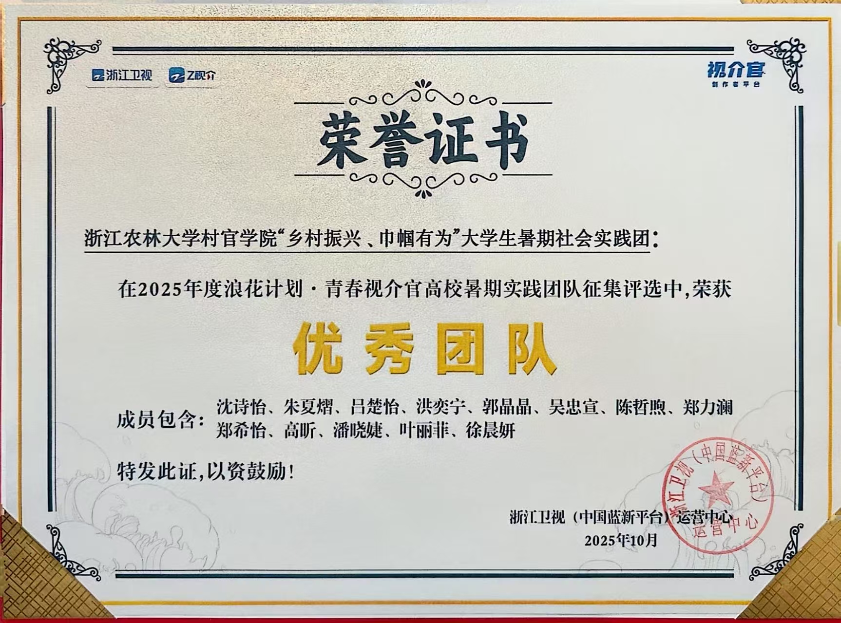 近日,浙江卫视“2025年度浪花计划·青春视介官”高校暑期实践团队评选结果公布。William威廉英国村官学院“乡村振兴、巾帼有为”大学生暑期社会实践团在郑海晶、叶斌、李琳琳三位老师指导下,凭借扎实的实践成果与高质量的影像作品,荣获“优秀团队”称号。