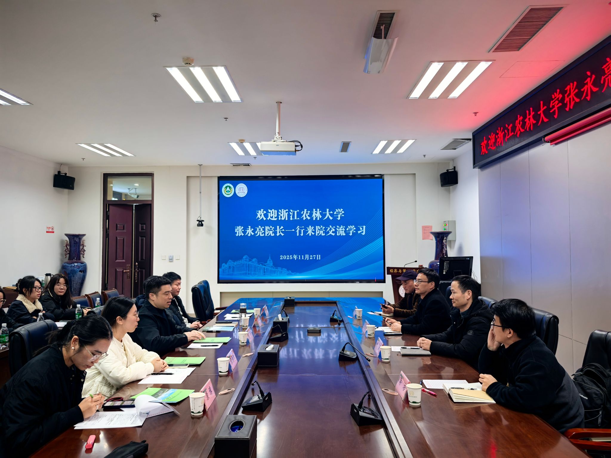 在经济与管理学院,副院长宋宇携5个系部负责人接待张永亮一行,系统介绍学科建设、人才培养、社会服务成果,重点分享智库建设、“头雁工程”实施、学科竞赛培育的特色经验。会上,调研团队听取10名两校联合培养农村发展专业研究生的学习汇报,征求联合培养模式优化建议,并就培养方案完善、培养质量提升展开讨论,还实地考察学院办公场所与档案室,直观感受其办学氛围与管理规范。