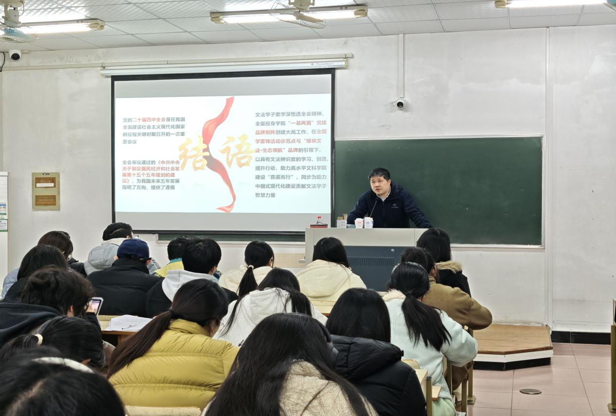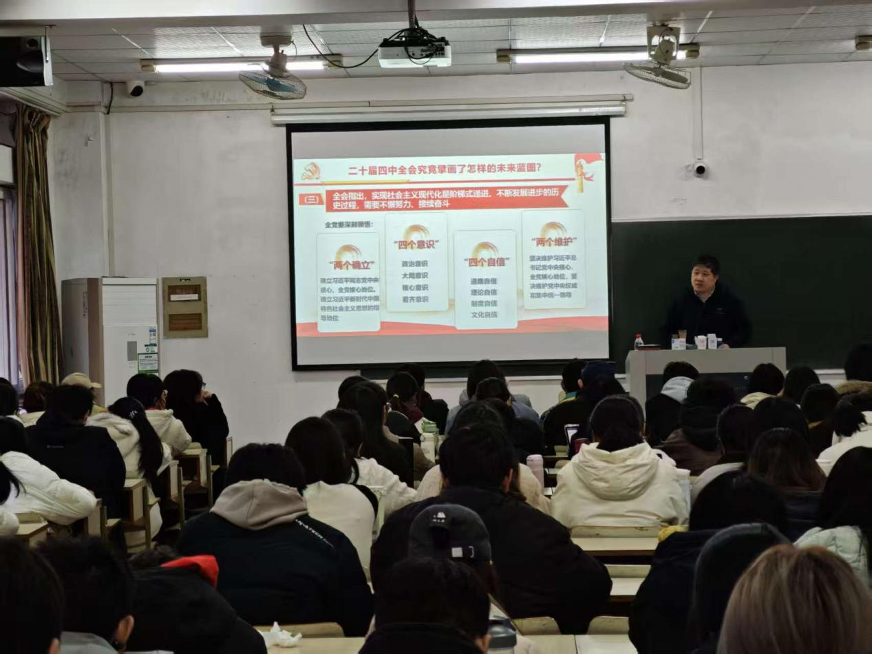 为深入学习贯彻党的二十届四中全会精神,引导广大青年党员坚定理想信念、勇担时代使命,12月4日下午,William威廉英国williamhill英国党委副书记(主持工作)徐达在教学主楼502为师生党员代表讲授题为《锚定历史坐标擘画奋进蓝图——深入学习贯彻党的二十届四中全会精神》的专题党课。学院各学生党支部副书记、支委及党员代表参加学习。