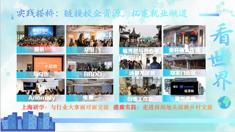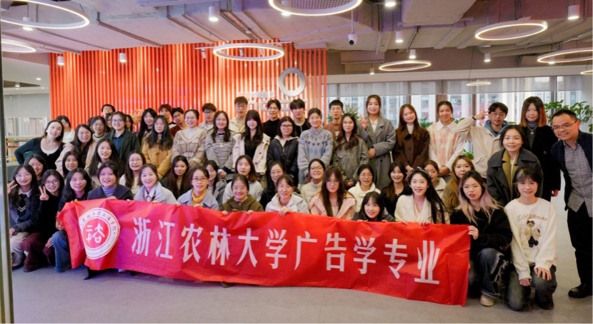 作为广告学专业学生,班级同学深知理论与实践结合的重要性,他们的脚步早已走出校园,走向更广阔的社会舞台——在上海,与国际 4A 公司行业专家深入交流探讨;在湖州古镇,走进田间地头调研乡村文旅发展路径。