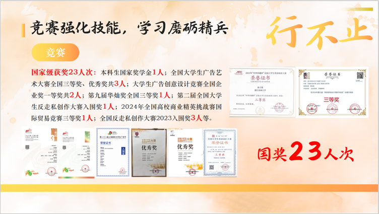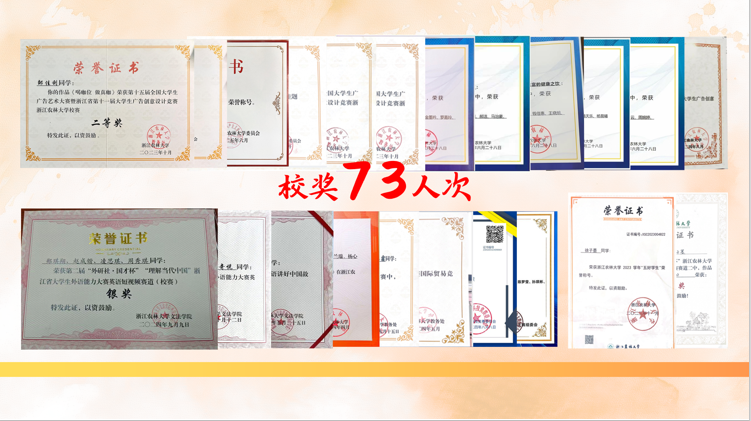 广告学222班在学科竞赛和创新实践中表现尤为突出,培育了“全员出战”的竞赛氛围,学科竞赛参与率达到100%。截至目前,班级同学累计获得国家级奖项23人次,包括国家奖学金、全国大学生广告艺术大赛、华灿奖等权威赛事奖项;获得省级奖项34人次,涉及高教社杯短视频大赛、反走私大赛、杭州文旅创意短视频大赛等多个比赛;校级奖项73 人次,班级累计获奖超130 项。