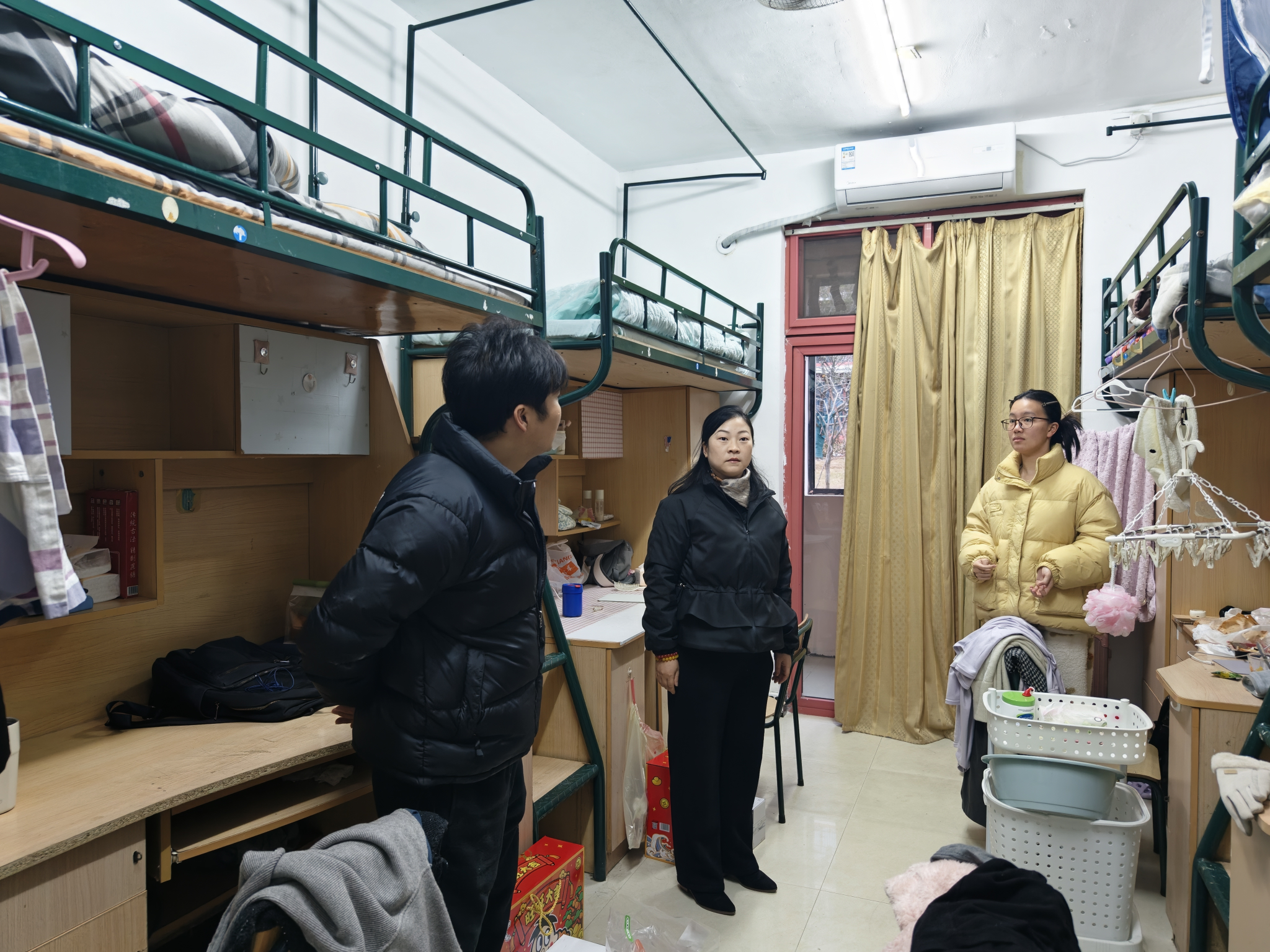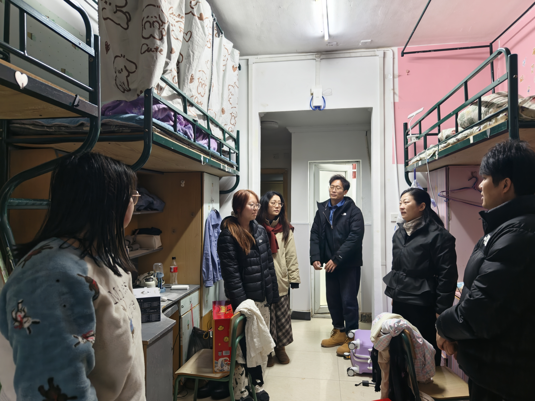 走访中,慰问组走进学生寝室与同学们细致交流,询问大家寒假学习计划与生活安排,耐心倾听实际需求。同时,重点检查寝室用电规范、消防设施完好情况,叮嘱学生“人离寝,电断牢”,杜绝违规用电,时刻注意防火安全;近期气温波动大,要及时增减衣物,做好防寒保暖等。