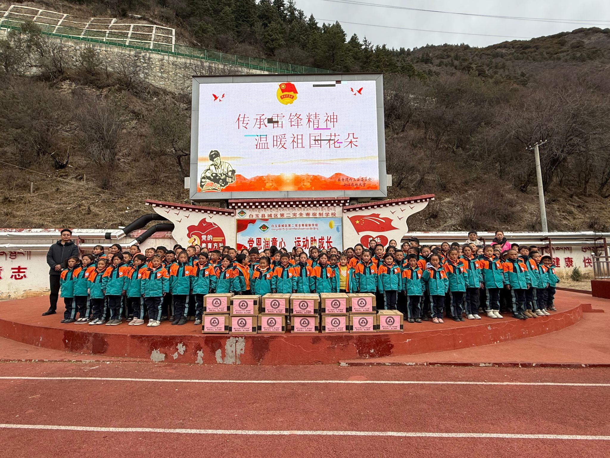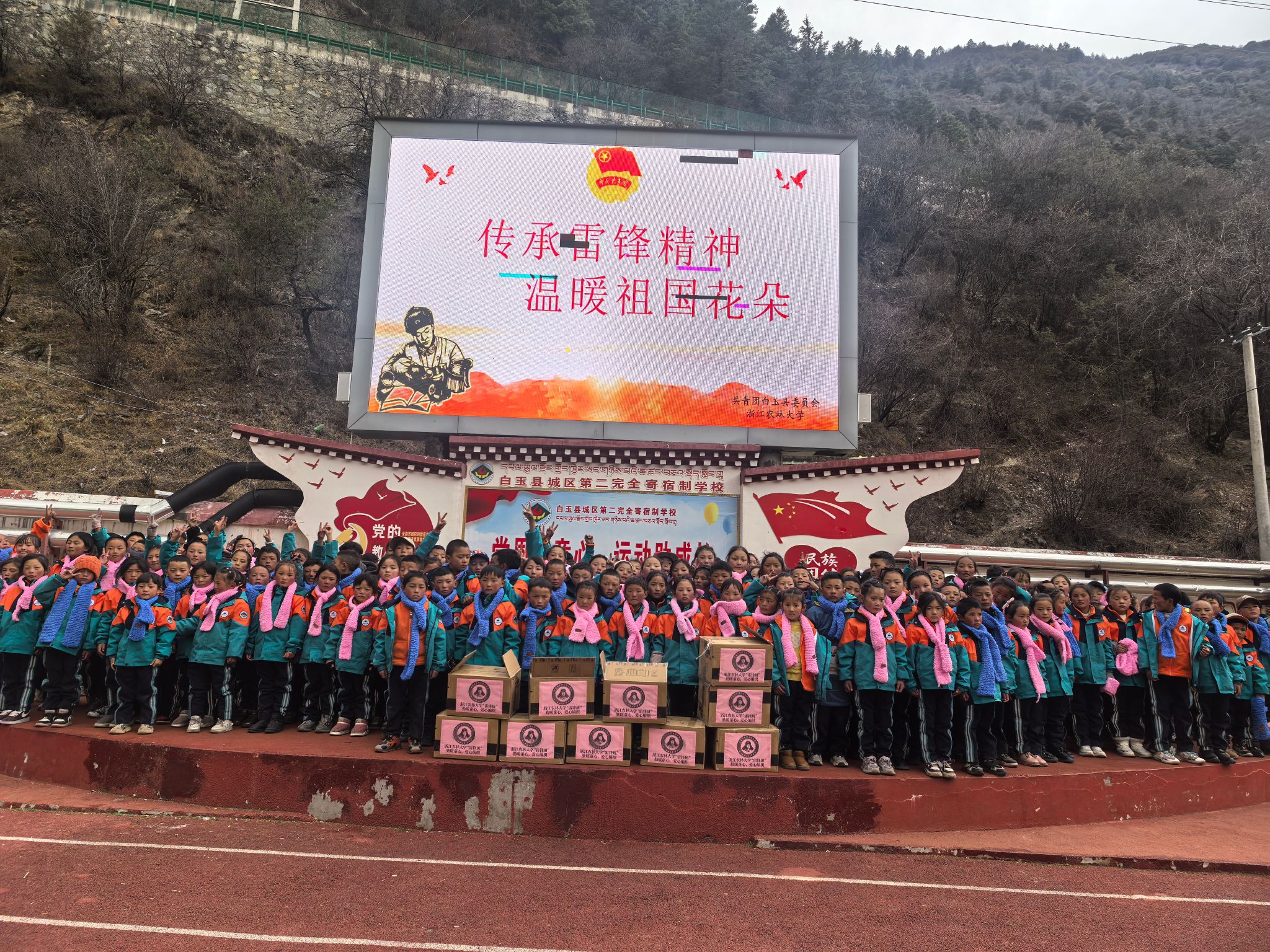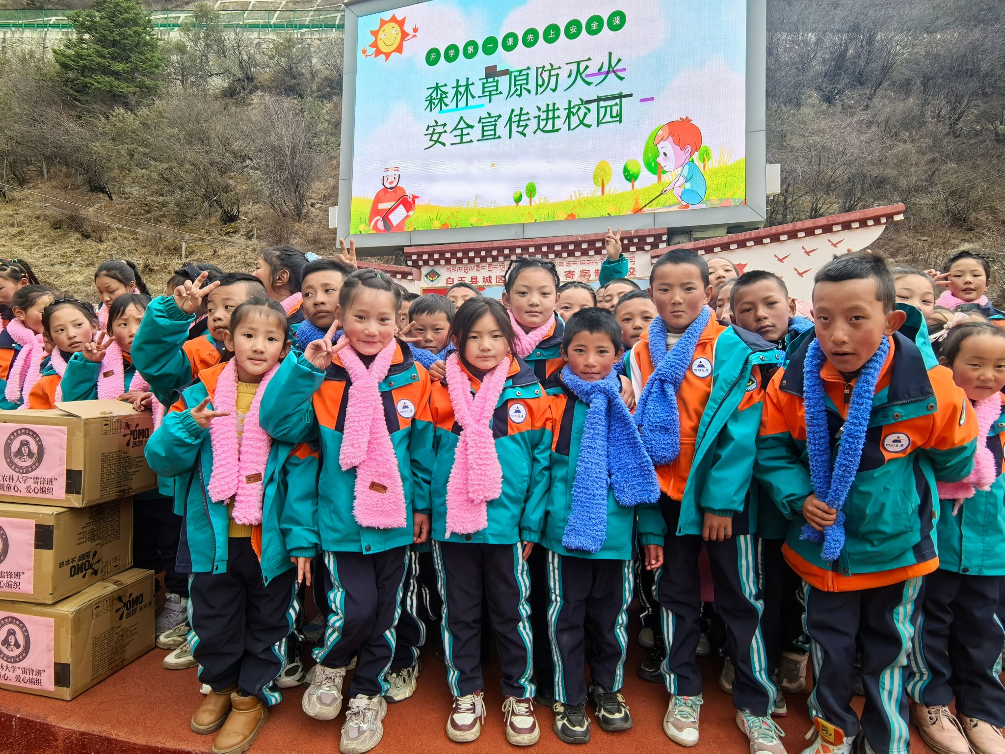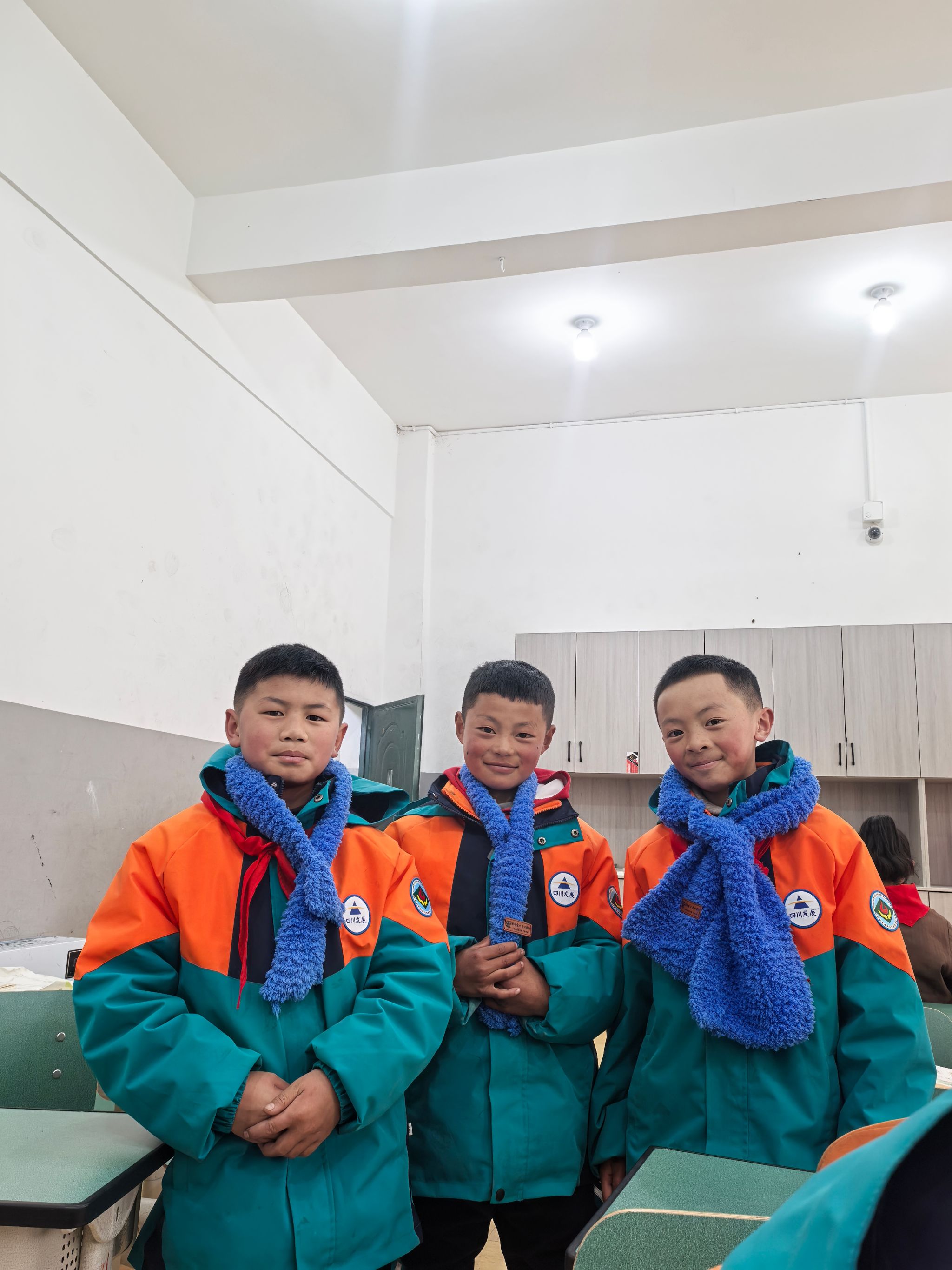 这批满载心意的围巾,最终送到了白玉县第二完全寄宿制学校500名小朋友的手中。捐赠仪式由共青团白玉县委副书记二西克格主持,当孩子们亲手把围巾围在脖子上,一张张稚嫩的脸庞瞬间漾起灿烂的笑容。“围巾又软又暖和,像小猫的毛,早上上学再也不怕冷风钻脖子啦”“我晚上睡觉都想抱着它,这个冬天一点都不冷了”,孩子们用最纯真的话语,诉说着满心欢喜。