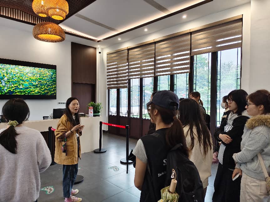 在西溪湿地运营公司相关负责人的带领下,师生一行首先参观了西溪湿地公园游船码头。作为国家5A级景区的唯一运营管理主体,西溪湿地运营公司依托国企平台的规范管理与稳定优势,致力于打造世界湿地保护与利用的典范。师生们实地走访了企业文化展示区与员工办公场所,深入了解了公司核心理念。置身于推窗见景、四季如画的湿地办公环境中,同学们不仅感受到了“城市绿肺”的生态之美,更对国企在生态保护与文旅运营中的社会责任有了直观认识。