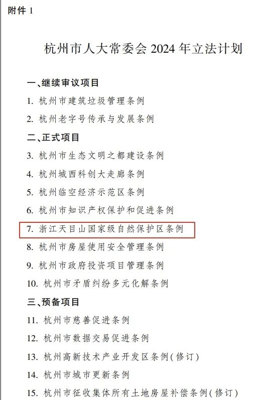 近日,杭州市人大常委会办公厅发布《杭州市人大常委会2024年立法计划》(杭人大常办〔2024〕22号),市人大常委会2024年立法计划项目共32件,其中正式项目8件,《浙江天目山国家级自然保护区条例》列入本年度立法计划正式项目。该条例草案分为总则、规划建设、资源保护、发展利用、监督管理、法律责任、附则,共7章42条。