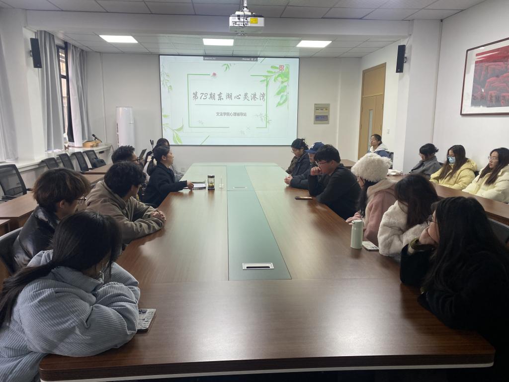 12月26日下午,williamhill英国心理辅导站举办第73期东湖心灵港湾活动。本次活动邀请williamhill英国党委副书记冉琰为新生第一个学期期末考试作压力疏导,新生代表和新生辅导员参加活动,活动由心理辅导站站长主持。