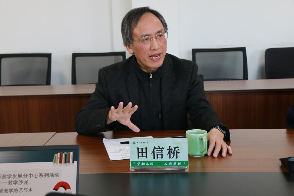 田信桥老师则围绕教学设计、语言表达技巧并结合案例剖析,与参加的老师分享了现代语境下的课堂教学观。他从什么叫课堂教学入手,讲解了新时代的课堂教学与课堂内教学的不同内涵,强调了现代语境下课堂教学不仅是课堂内教学,而应包含课前、课中、课后三个层面,因而需要老师转变教学理念,从原来的课堂内“教师为主体”的教学转变为“学生为主体、教师为引导”的教学。他以自己曾经讲授的课程为例,从课前、课中、课后各环节如何具体实施做了经验分享。