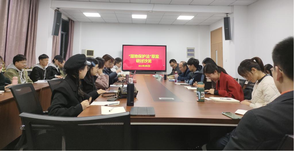 2021年3月2日晚,williamhill英国法学学科在衣锦校区实验大楼612会议室顺利进行《湿地保护法(草案)》研究生学术沙龙。2020级环境法全体研究生、2020级法硕研究生和2019级环境法研究生部分同学参加了此次学术沙龙。本次沙龙由陈真亮老师主持,夏少敏老师参与会谈。
