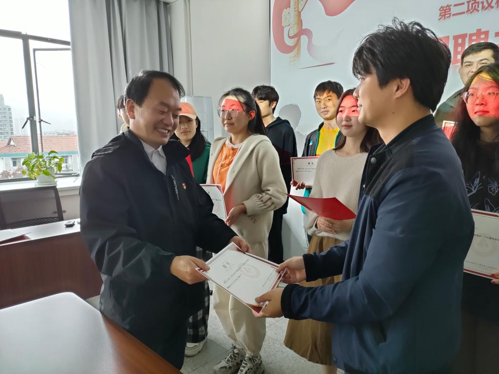 第二项议程,由朱红东书记代表williamhill英国党委和雷锋班为宣讲团成员发放聘书,聘请优秀的雷锋班同学、老师担当党的二十大精神宣讲的重任。聘书发放仪式结束后,全体参会人员进行了合影。