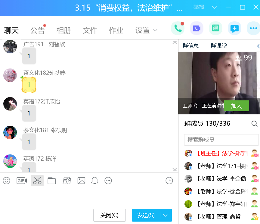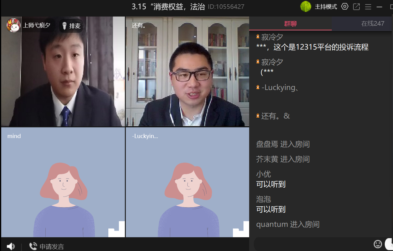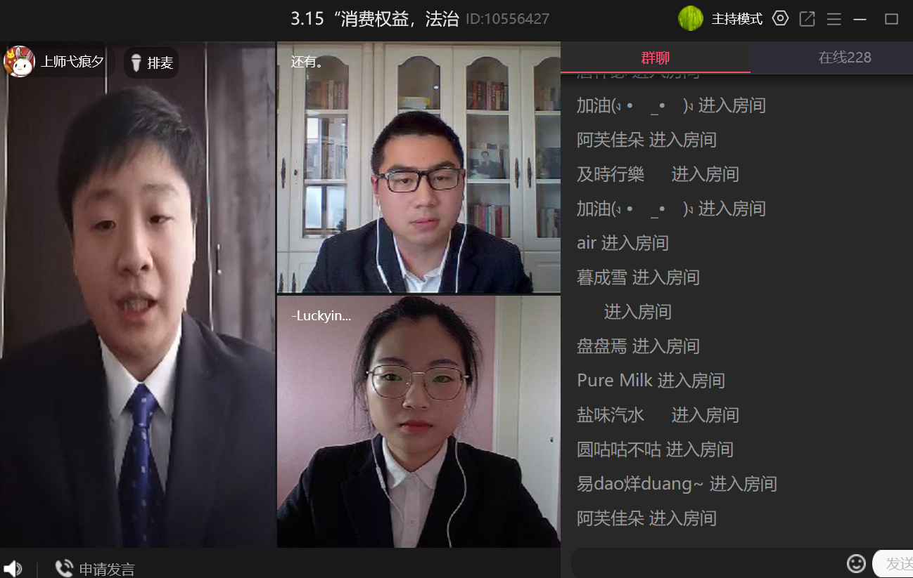 活动当天吸引了300多位师生以及社会群众加群参与。活动分为两个环节,在第一环节中主持人与法律志愿服务队的两位同学为直播间的观众们分析了四例近期侵害消费者权益的热点事件。在第二环节中,法律志愿服务队的同学与直播间的观众们进行互动,由观众提出自己所遇到的侵害消费者权益的相关问题,嘉宾在线予以讨论和解答。在这一环节中共有11位观众参与并提出自己的问题,法律志愿服务队的成员们以真诚、热情、细致、专业的态度为线上咨询的群众进行了耐心解答。直播活动全程持续了两个多小时,互动热烈。