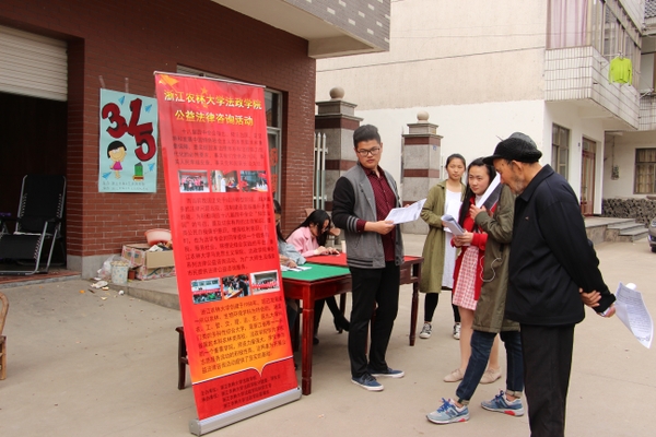 为响应十八届四中全会的号召,加强基层普法宣传,弘扬法治精神,同时贯彻落实“双百双进”活动的要求,3月19日,法政学院“雷锋班”赴临安集贤村开展“送法下乡”公益法律咨询服务活动。