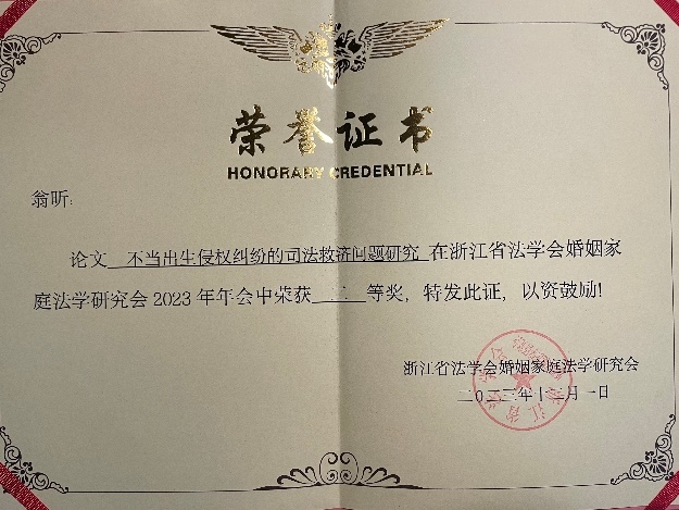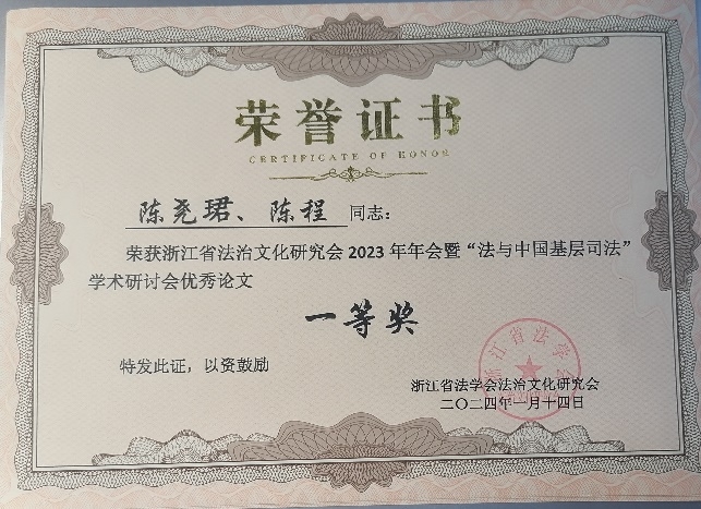 为提升法学本科教育学术交流氛围,2023年年底,法学专业师生及我校乡村振兴法治研究所成员陆续向浙江省法学会宪法与地方立法学研究会等9场学术年会提交论文20余篇。2021级学生翁昕的论文获得浙江省法学会婚姻家庭法学研究会2023年学术年会论文二等奖,邓婕的论文获得浙江省法学会法律文化研究会2023年学术年会学生组论文三等奖,2021级法学专业学生吴品娴、陈雨洁等撰写的论文获得浙江省法学会三农法治研究会2023年学术年会“青年工作坊”学生组论文二等奖,金威、刘榕榕撰写的论文获得“青年工作坊”学生组论文三等奖。在浙江省法学会法治文化研究会2021年学术年会上,我院法学教师郑智副教授、讲师刘辉及2019级本科生谢淼淼也曾报告论文要点,并分别获得教师组一、二等奖以及学生组一等奖。