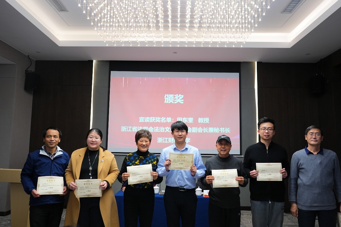 杭州师范大学蒋铁初教授主持第三阶段的主题研讨,中国计量大学范晓宇教授和浙江财经大学钱炜江副教授与谈点评。会议闭幕式由北京观韬中茂(杭州)律师事务所合伙人麻侃律师主持,浙江财经大学田东奎教授宣读获奖论文名单。我院师生及我校乡村振兴法治研究所成员共提交论文8篇,刘辉老师获得教师组论文二等奖,法学专业2021级学生陈尧珺等获得学生组论文一等奖、叶秉获得二等奖、童韵琳等获得三等奖。