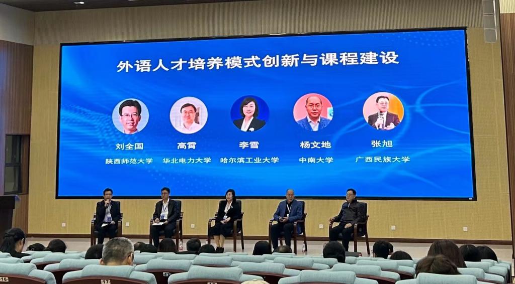 北京外国语大学中国外语与教育研究中心主任王文斌教授、华南农业大学外国学院院长黄国文教授、山东大学外国语学院翻译学院院长王俊菊教授、电子科技大学外国语学院院长胡杰辉教授、广西大学外国语学院院长罗选民教授作大会主旨报告。与会专家围绕中国外语学术话语体系构建,外语人才培养模式创新与课程建设和人工智能赋能外语教育开展三个专题研讨。