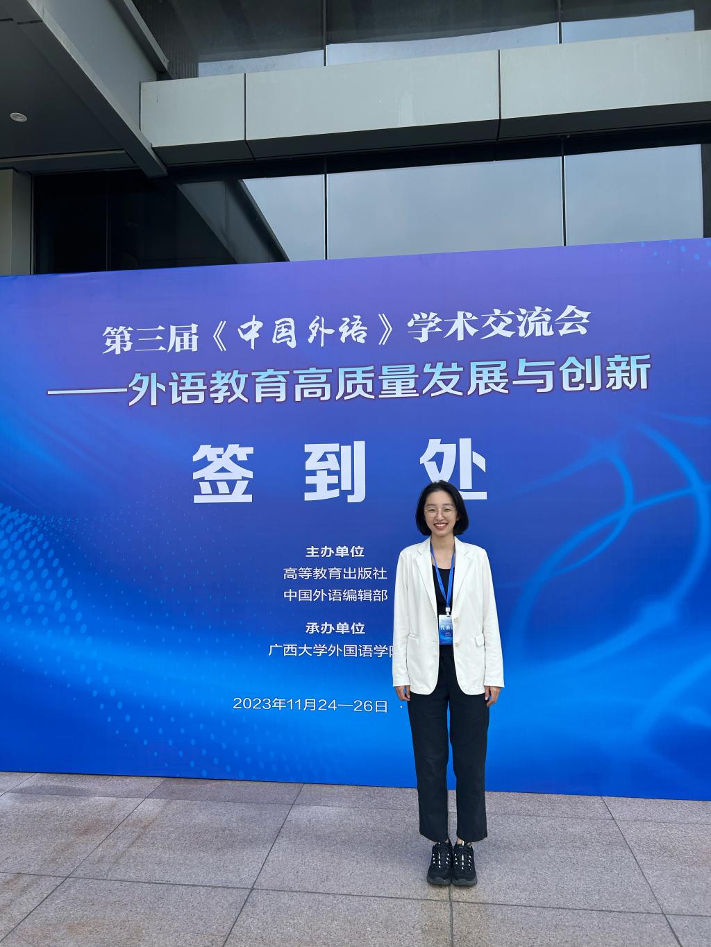 2023年11月24—26日,由高等教育出版社和中国外语编辑部主办、广西大学外国语学院承办的“第三届《中国外语》学术交流会——外语教育高质量发展与创新”在广西南宁成功举办。会议以“思政育人·学科融合——以‘四新’建设引领外语教育高质量发展与创新”为主题,围绕外语课程思政、“四新”背景下的外语学科建设、中国外语学术话语体系构建、新时代外语人才培养模式创新与课程建设、人工智能赋能外语教育等议题展开研讨。我院教师陶晨萍参加了本次会议。