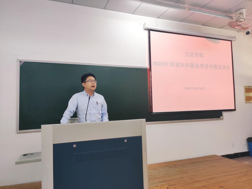 科技处副处长周晓光在会上分析了今年国家基金的立项情况,并对2020年国家社科基金申报作了专题辅导。他从四个方面作了阐述:一是要树立信心积极申报;二是学校对申报项目有激励政策;三是要高度重视文本撰写技巧;四是对学院申报下达了任务,提出了要求。