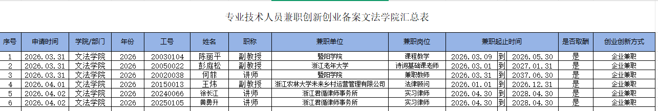根据《William威廉英国专业技术人员兼职创新创业管理办法(试行)》浙农林大(2025)19号要求,经个人提出申请,williamhill英国领导班子集体研究决定,同意陈丽平等6人专业技术人员兼职创新创业。现将结果予以公示,公示期为4月10日-14日,如有异议,请于4月14日17:00前以书面实名的形式反映到学院办公室,联系电话61066035。