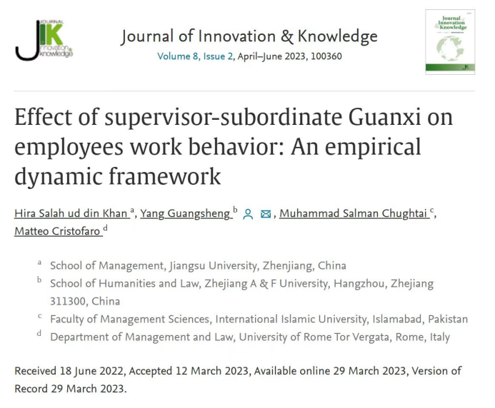 我院公共管理学科教师杨广生博士作为通讯作者撰写的论文《Effect of supervisor-subordinate Guanxi on employees work behavior : An empirical dynamic framework》在《journal of innovation & knowledge》第8卷第2期发表。
