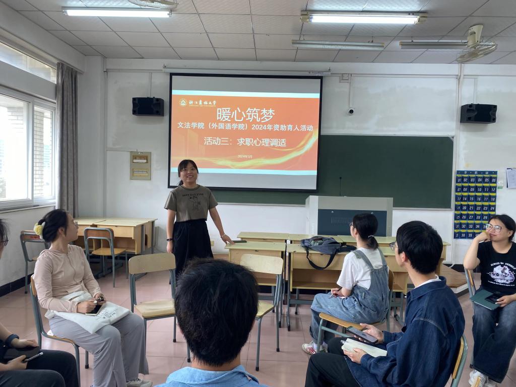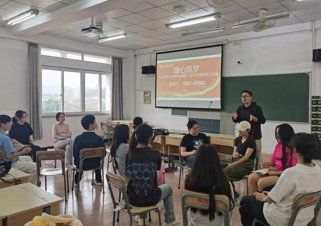 5月23日下午,“暖心筑梦”williamhill英国2024年资助育人活动之求职心理调适活动,在衣锦教学主楼510,面向大三学生开展。